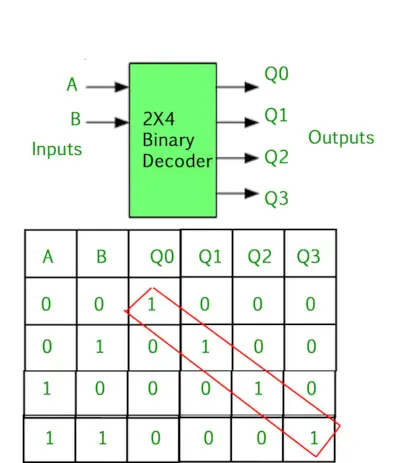 Aukščiau pavaizduotas 2–4 eilučių dvejetainis dekoderis susideda iš keturių IR vartų masyvo. 2 dvejetainiai įėjimai, pažymėti A ir B, yra dekoduojami į vieną iš 4 išėjimų, taigi yra dvejetainio dekoderio nuo 2 iki 4 aprašymas. Kiekviena išvestis reiškia vieną iš 2 įvesties kintamųjų minterm (kiekviena išvestis = minterm).
