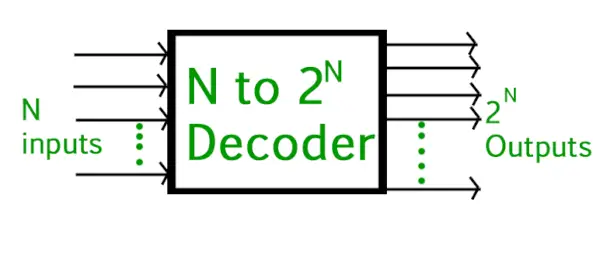 - Jei dvejetainis dekoderis gauna n įėjimų, jis suaktyvina vieną ir tik vieną iš 2^n išėjimų, remdamasis tuo įėjimu, o visi kiti išėjimai yra išjungti. Jei n bitų koduota informacija turi nenaudotų derinių, dekoderis gali turėti mažiau nei 2^n išėjimų.