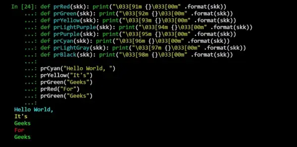 def> prRed(skk):> print> (> ' 33[91m {} 33[00m'> .> format> (skk))> def> prGreen(skk):> print> (> ' 33[92m {} 33[00m'> .> format> (skk))> def> prYellow(skk):> print> (> ' 33[93m {} 33[00m'> .> format> (skk))> def> prLightPurple(skk):> print> (> ' 33[94m {} 33[00m'> .> format> (skk))> def> prPurple(skk):> print> (> ' 33[95m {} 33[00m'> .> format> (skk))> def> prCyan(skk):> print> (> ' 33[96m {} 33[00m'> .> format> (skk))> def> prLightGray(skk):> print> (> ' 33[97m {} 33[00m'> .> format> (skk))> def> prBlack(skk):> print> (> ' 33[98m {} 33[00m'> .> format> (skk))> prCyan(> 'Hello World, '> )> prYellow(> 'It's'> )> prGreen(> 'Geeks'> )> prRed(> 'For'> )> prGreen(> 'Geeks'> )> |
